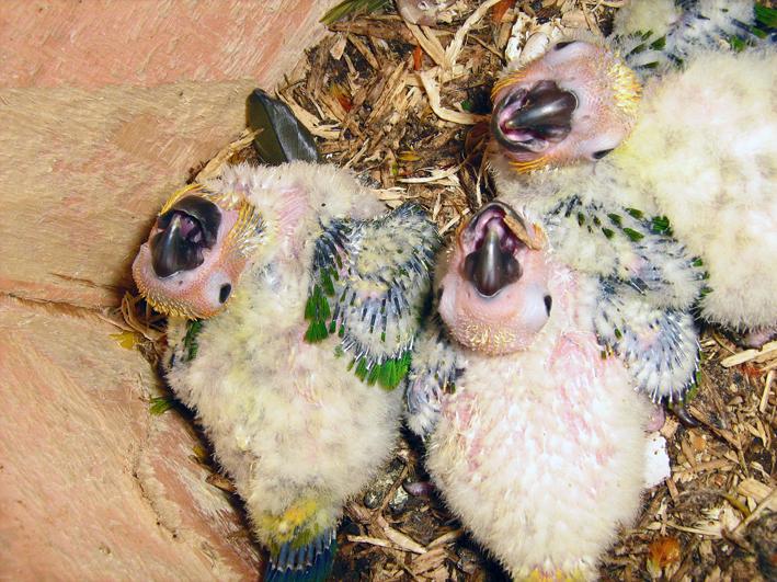 Pullus di Aratinga solstitialis (Conuro del Sole)