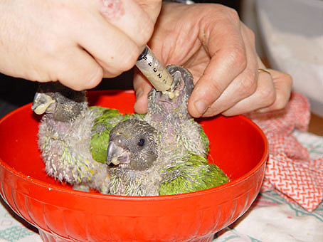 Come “pappa” usai la Pretty Bird Hand Rearing Formula (protein-fact 19/12) adatta ai pappagalli africani.I piccoli avevano circa sei giorni e necessitavano ancora delle imbeccate notturne, che sono le più difficili da dare, visto che tutti in famiglia lavorano e che il risveglio forzato notturno comporta dei sacrifici, ma che vengono sempre ripagati. Importante è acquisire esperienza con la temperatura dell’acqua da miscelare alla pappa