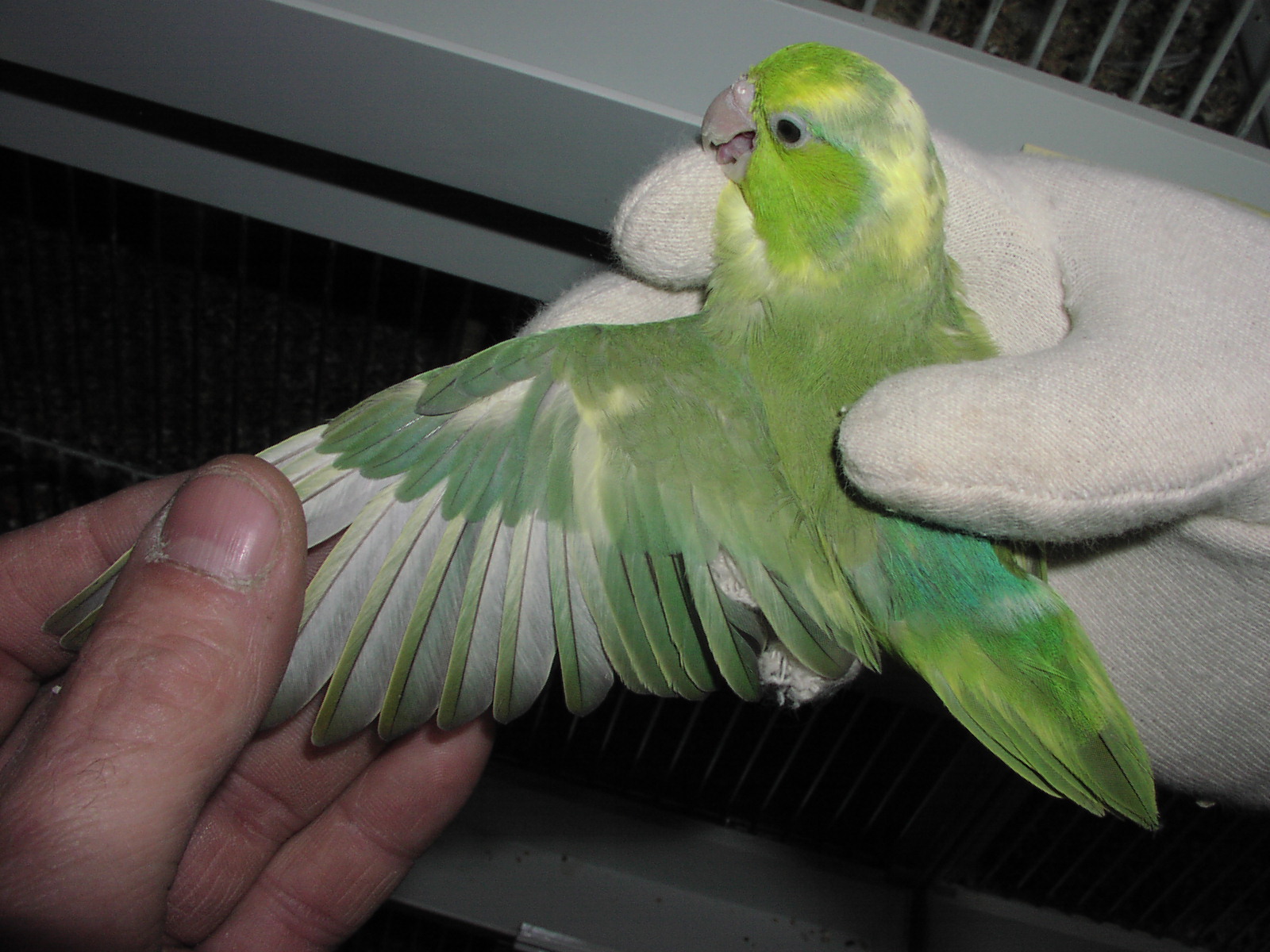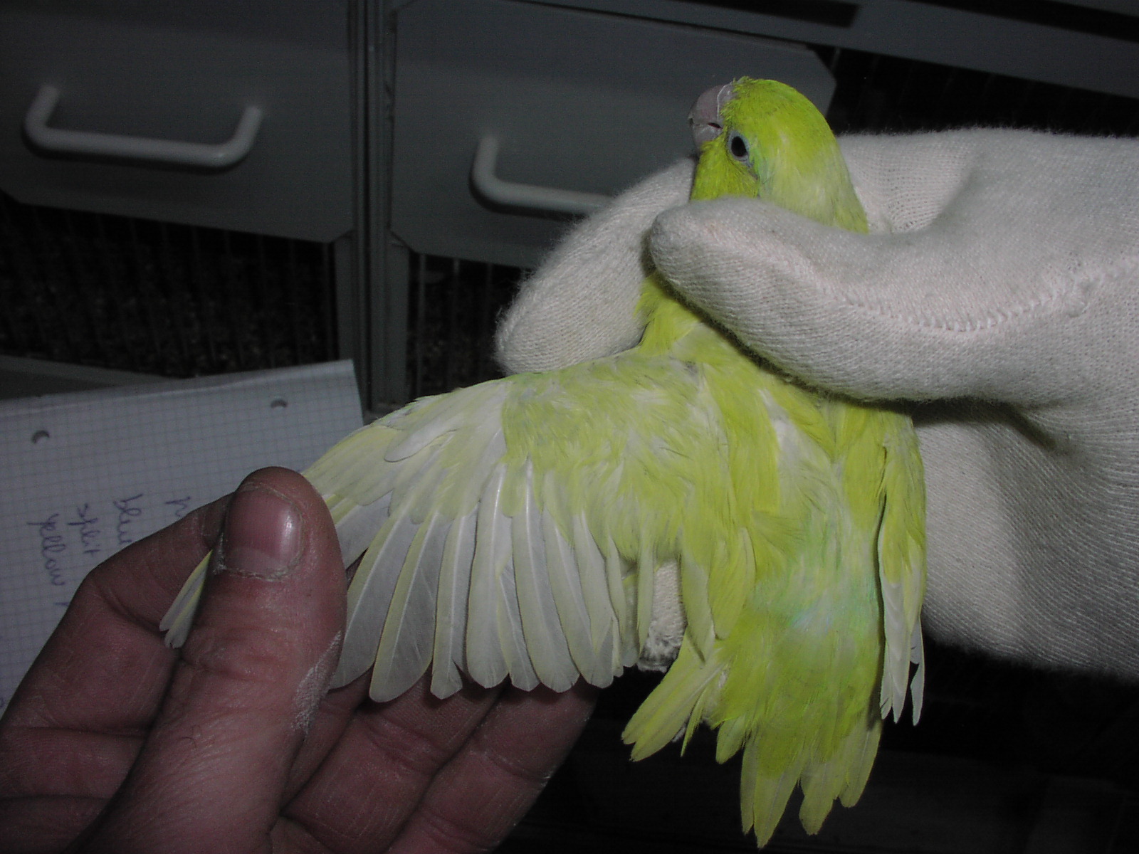 I pullus nascono con pelle rosea, occhi chiusi e con il corpo ricoperto di una leggerissima e rada peluria bianco-grigia e vengono alimentati inizialmente solo dalla femmina a sua volta alimentata dal maschio. Nel giro di 10/12 giorni aprono gli occhi ed iniziano a mettere le penne. Il primo nato si differenzia dall’ultimo ben più rispetto a quanto potrebbe essere dovuto per motivi temporali, inoltre i pullus sono paurosi e temono le visite periodiche dell’allevatore. I novelli hanno abbandonato il nido dopo 34 giorni giorni e sono rimasti con i genitori fino al 44 giorno, cosa essenziale per un corretto sviluppo successivo. Successivamente li ho separati con il divisorio consentendo ancora sporadiche imbeccate dal maschio fino al 55 giorno, in quanto nel frattempo le femmine si sono dedicate ad una nuova cova. Nel periodo di svezzamento è opportuno somministrare nel pastoncino dei sali minerali ed un complesso multivitaminico in gocce nell’acqua di bevanda. Nel caso non si voglia permettere una nuova cova è bene togliere il nido onde evitare che il maschio voglia riaccoppiarsi e quindi diventi violento con i novelli. Inoltre, prima della successiva cova, uso somministrare ai riproduttori dell’aceto di mele nel beverino, per ristabilire il giusto ph e regolarizzare l’assorbimento metabolico.