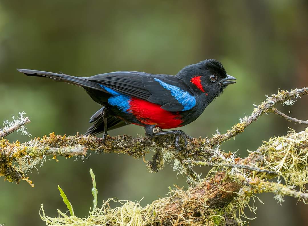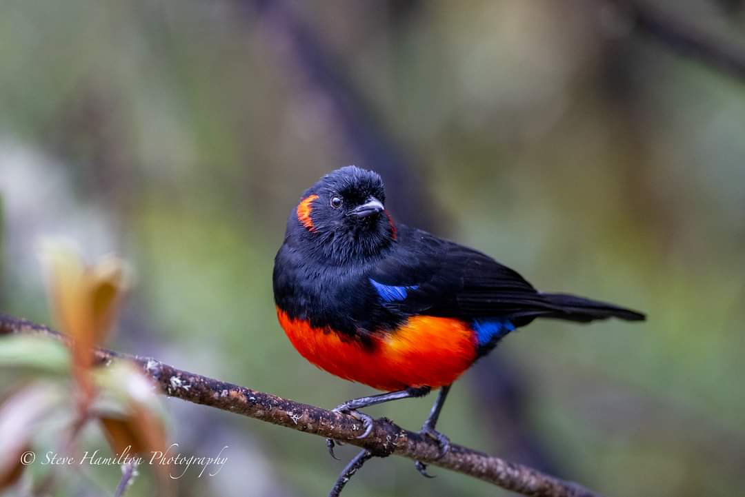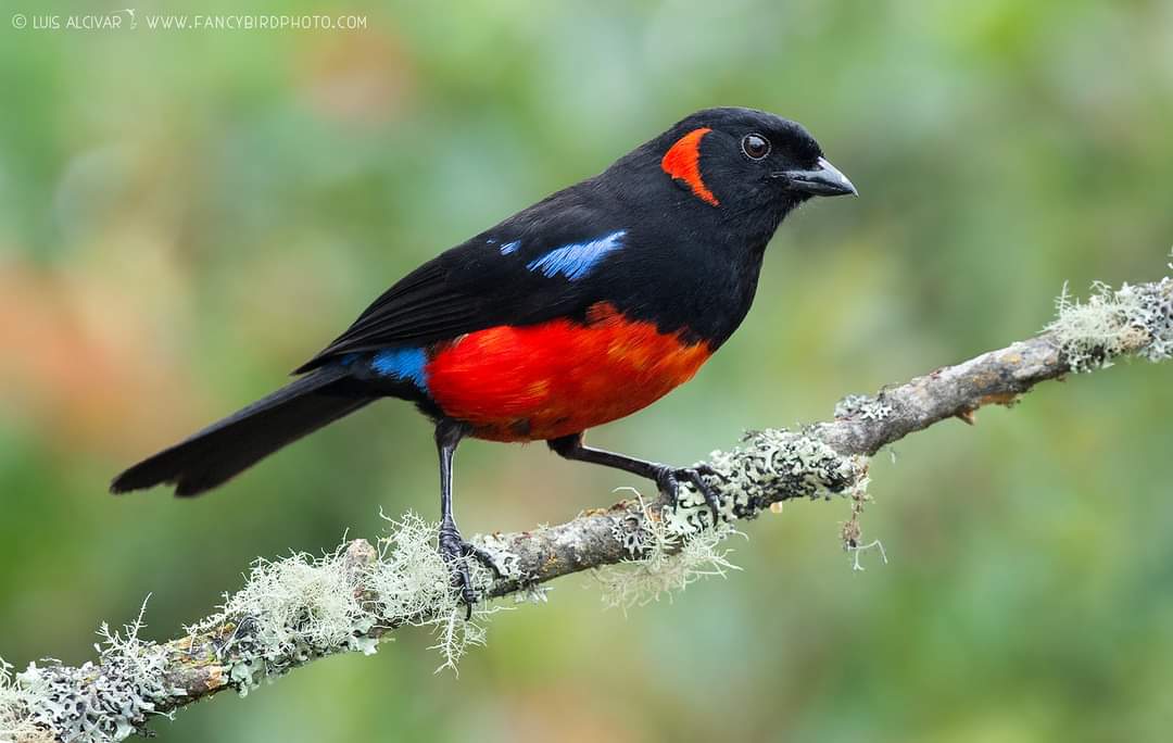 Comune e inconfondibile. Per lo più nero con pancia rosso vivo, benda rossa sull'orecchio e groppa e spalla blu. I giovani uccelli sono di colore arancione più opaco anziché rosso. Coppie o piccoli stormi foraggiano a tutti i livelli della foresta montana e ai margini, spesso con stormi di specie miste. È diffusa dall'estremo Venezuela occidentale alla Bolivia, da circa 2.600 a 3.600 m. Ascolta una canzone strana: un miscuglio sconclusionato di cigolii e tintinnii.