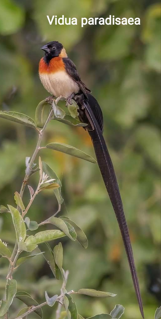 La Vidua paradisaea appartiene alla famiglia Viduidae dell'ordine Passeriformes. Sono piccoli passeriformi con banconote corte e tozze che si trovano in tutta l'Africa subsahariana. Sono per lo più granivori e si nutrono di semi che sono maturati e cadono a terra. La capacità di distinguere tra maschi e femmine è abbastanza difficile a meno che non sia la stagione riproduttiva. Durante questo periodo, i maschi muoiono nel piumaggio riproduttivo dove hanno una caratteristica distintiva che è la loro lunga coda. Può crescere fino a tre volte più a lungo del proprio corpo o anche di più. Di solito, i whydah sembrano normali passeri con la coda corta durante la stagione non riproduttiva. Inoltre, l'ibridazione può verificarsi con questi whydah paradisiaci. I maschi sono in grado di imitare le canzoni in cui le femmine possono usarlo per scoprire il loro compagno. Tuttavia, ci sono alcuni casi in cui le femmine non usano le canzoni per scegliere il loro compagno ma usano caratteristiche maschili come i piumaggi o possono avere una carenza di opzioni con il mimetismo delle canzoni. I whydah del paradiso sono parassiti della covata. Non distruggeranno le uova che sono originariamente lì, ma deporranno le proprie uova nel nido di altri uccelli canori. Nel complesso, questi whydah sono considerati i meno preoccupati sulla base della Lista Rossa IUCN delle specie minacciate.