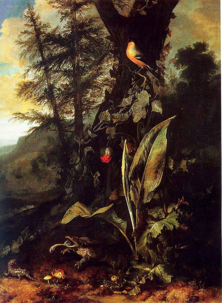 Il quadro di Withoos, anche se esaminato sommariamente, rivela la presenza di alcuni aspetti contrastanti e sicuramente di un certo interesse. Ad un primo piano di sottobosco, tendenzialmente scuro e abbastanza circoscritto, si contrappone uno sfondo paesaggistico che acquista profondità e luminosità. Inoltre, al dinamismo dei due rettili, posti per terra e all'inizio della scena, fa riscontro l'immobilità del volatile riprodotto nell'area superiore della tela. Ma aldilà di queste peculiarità prospettiche e “dinamico-statiche” che, come già rilevato, sono di facile individuazione, ad una più attenta visione dell'opera si fa viva la sensazione che l'artista abbia proposto interessanti messaggi attraverso il linguaggio dei simboli. Così, non è occasionale la scena del rospo che, con la bocca spalancata e la lingua fuoriuscita, sembra colto mentre spicca un balzo aggressivo ai danni della vicina lucertola.