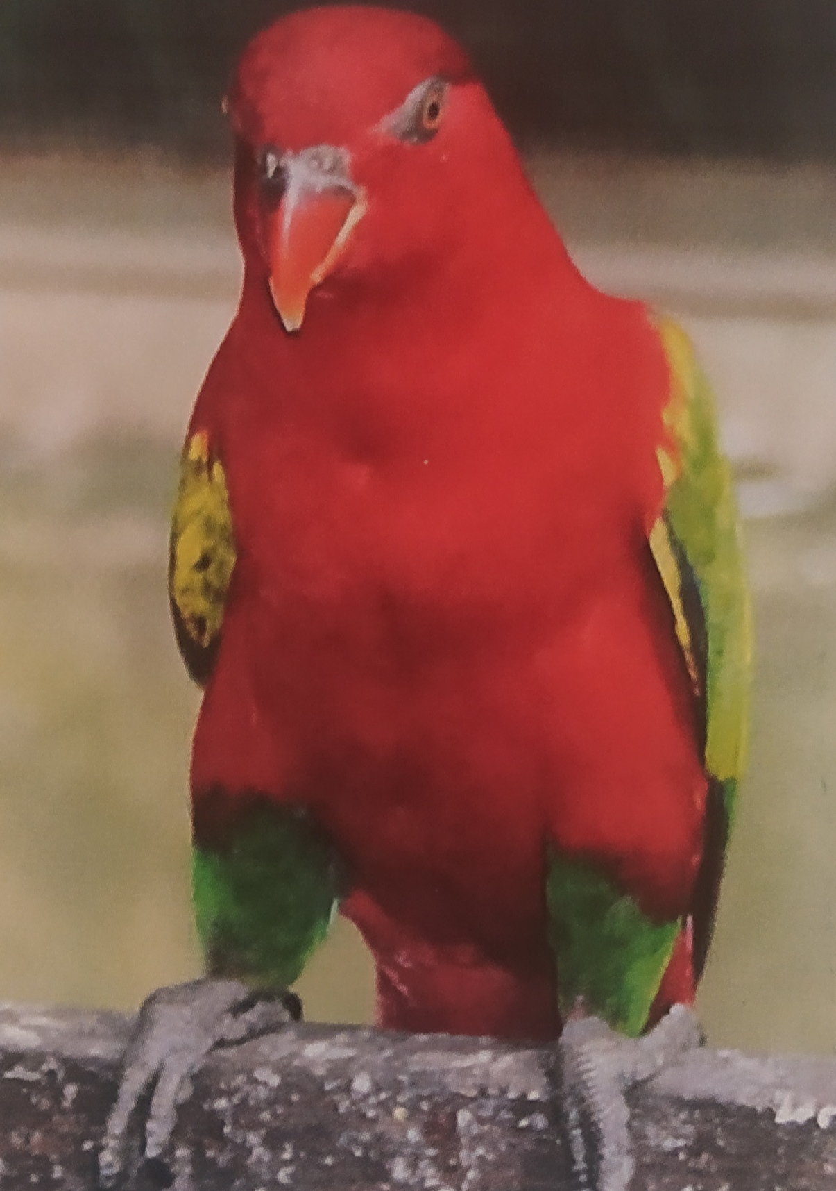 Il Lori Garrulo (Lorius garrulus, Reichenow), chiamato anche Domella Garrula. Di colore rosso, tendente arancio e non al blu, come il Lori rosso (Eos bornea). Le ali sono verdi. Le remiganti hanno un vessillo esterno verde con punta nera, mentre il vessillo interno è nero con una macchia di colore salmone nel mezzo. La coda è rosso scuro con il margine verde cupo tendente al nerastro e con una sfumatura blu che varia con la luce. La piegatura delle ali è giallo limonecon mescolate piumette striate di verde scuro. La parte inferiore dell’ala è giallo-verde-grigio-nerastra, con macchie colore salmone. Ora possiamo dire che come tutti i Lori è di umore socievole, sempre pronto per il gioco, infatti possono diventare domestici e divertenti. Come tutti i Lori amano fare in bagno, riescono a sopportare temperature fino a -4 gradi.