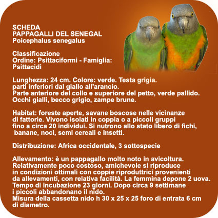 I tre Senegal cominciavano allegri a becchettare. Dopo qualche giorno non vollero più la siringa e ci misero molto più impegno a sgusciare i semi e a mangiare il pastoncino tipo Tropical della “Orlux”. Si fecero più intraprendenti e giocherelloni, spesso tenuti sulla spalla, iniziavano con voli un po’ maldestri a ispezionare la stanza dove venivano tenuti. I Senegal sono pappagalli dolcissimi, poco rumorosi, di facile mantenimento, ideali per iniziare a conoscere il mondo degli Psittacidi. Purtroppo non sono allevati in gran numero, perché ancora si trovano soggetti di cattura che costano molto poco. Ma la differenza tra coppie nate in cattività e quelle di cattura è notevole; i soggetti di cattura accentuano per molto tempo la loro timidezza e paura nei confronti dell’uomo, cosa che non accade con soggetti provenienti da allevamenti e regolarmente anellati. Chi volesse allevare questi bellissimi e affascinanti pappagalli, si rivolga ad allevamenti sicuri e non comperi soggetti di cattura.